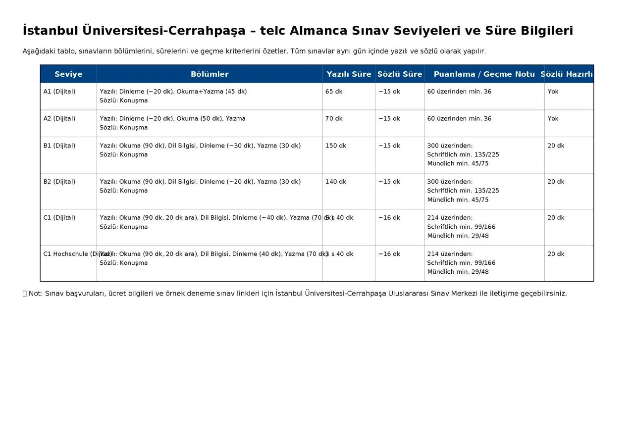 Telc sınavlarına hazırlanan adayların en çok merak ettiği konular arasında sınavın toplam süresi, yazılı ve sözlü bölümlerin detayları ile puanlama sistemi ön plana çıkmaktadır. Her bir Telc seviyesine ait sınavın süresi ve bölümlerinin ayrıntıları, başarıya ulaşmak için gerekli olan puanlama kriterleriyle birlikte titizlikle açıklanmaktadır. Bu bilgiler, adayların sınav hazırlıklarını daha verimli planlamalarını ve süreci doğru yönetmelerini sağlamak üzere rehber niteliği taşımaktadır. Özellikle Telc A1, A2, B1, B2, C1 ve C2 sınavlarıyla ilgili verilen bilgiler, sınavın yapısını daha iyi anlamanıza ve başarıya giden yolda stratejik bir hazırlık yapmanıza yardımcı olacaktır. Hazırlanan tablo sayesinde, hangi Telc sınavının kaç saat sürdüğünü, yazılı ve sözlü bölümlerin sürelerini, başarı ölçütlerini ve geçme puanlarını kolayca görebilirsiniz. Paylaşılan bu bilgiler sayesinde, Telc sınavına hazırlık sürecinizde daha bilinçli hareket edebilir ve sınavı en verimli şekilde tamamlayabilirsiniz.